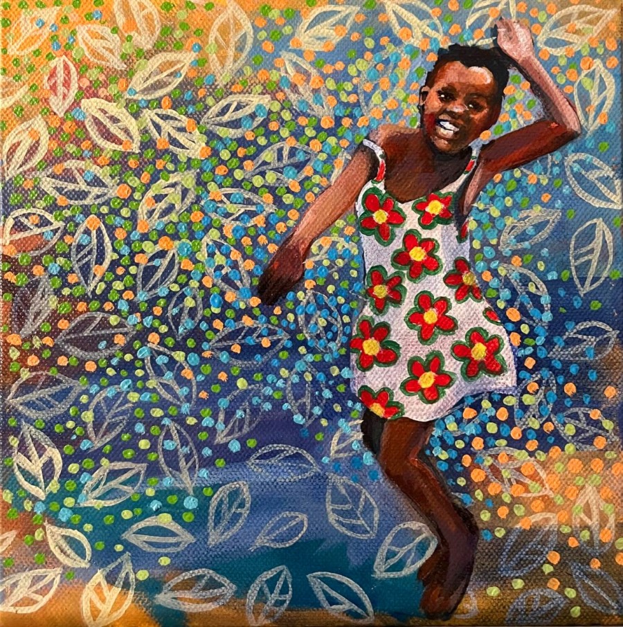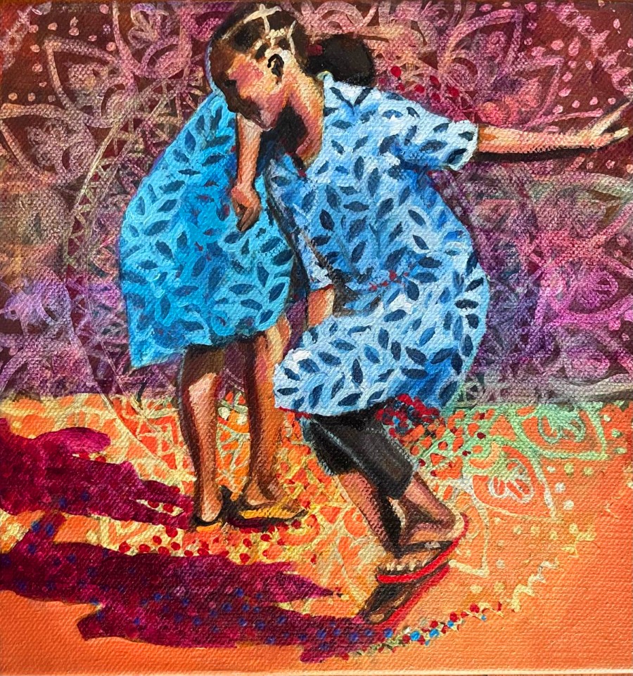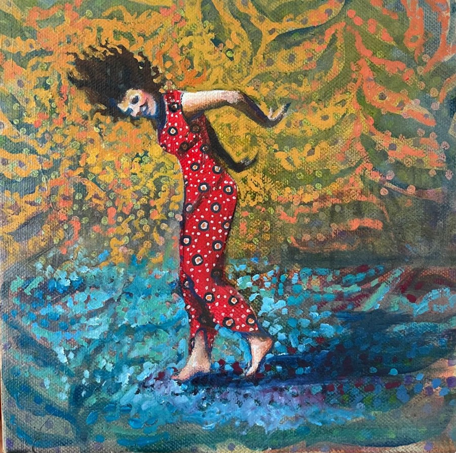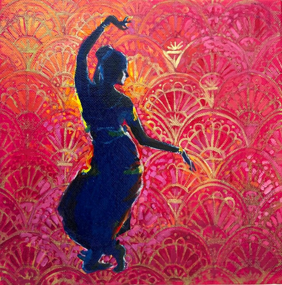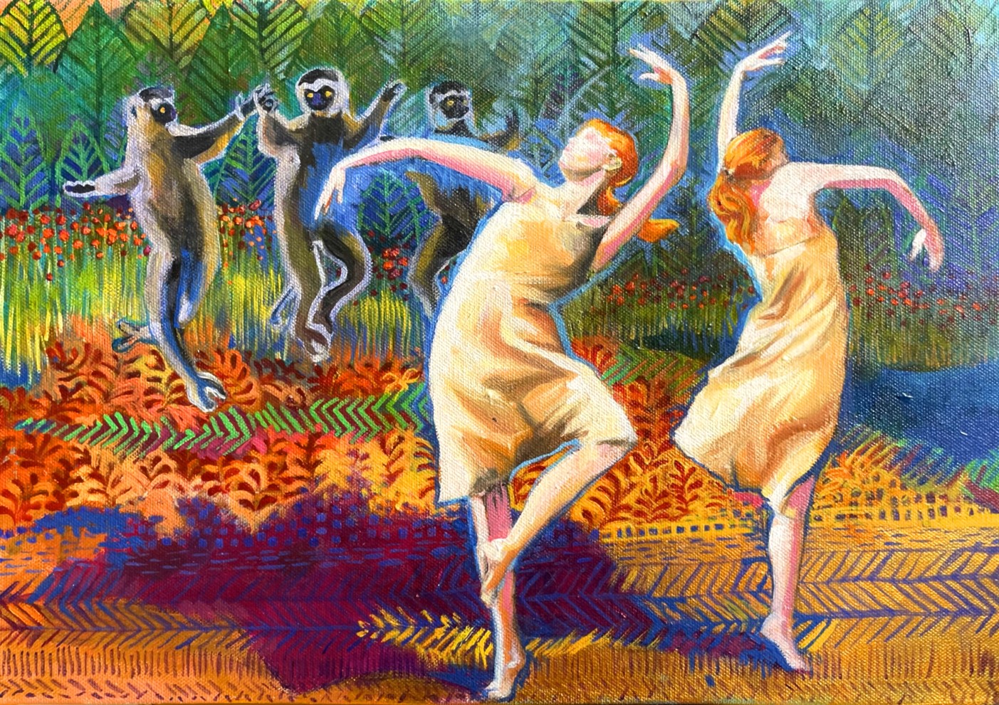I also find rich colour irresistibly joyous. I try not to use all the colours in every painting, but in this series, I’ve given that tendency free rein. I can’t resist the pull of patterning either: every surface, if it stands still long enough, gets lit up with its own pattern. Eventually, I started inviting animals to join in the dance – lemurs, wild dogs and sheep all begged to have a go, and I let them, with a heart full of joy.